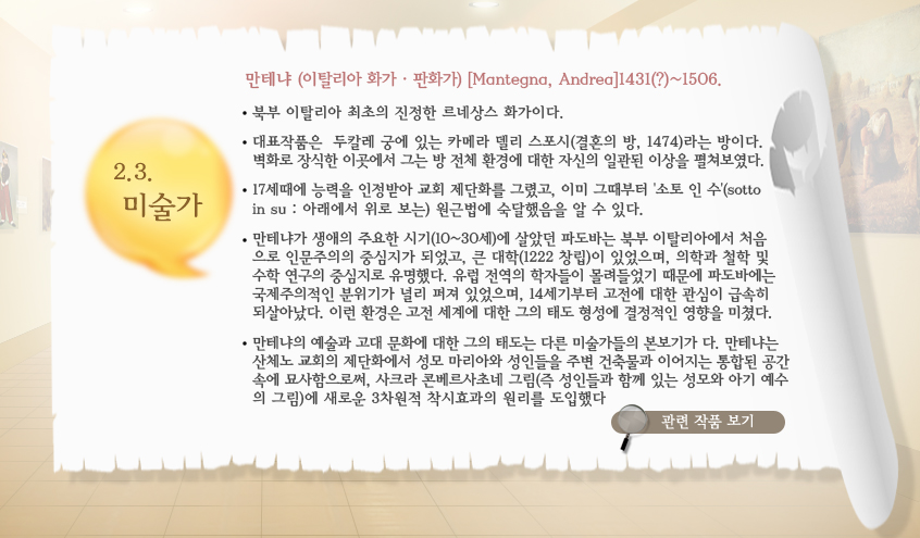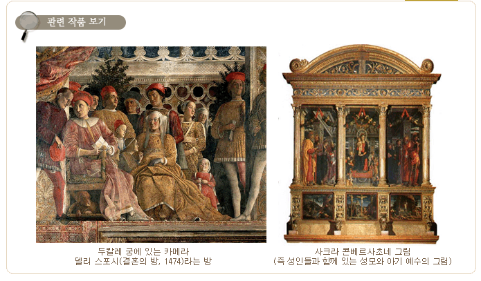 - 2.3. ¹Ì¼ú°¡ ¸¸Å×³Ä (ÀÌÅ»¸®¾Æ Ȱ¡¡¤ÆÇȰ¡) [Mantegna, Andrea]1431(?)~1506. - ºÏºÎ ÀÌÅ»¸®¾Æ ÃÖÃÊÀÇ ÁøÁ¤ÇÑ ¸£³×»ó½º Ȱ¡ÀÌ´Ù. - ´ëÇ¥ÀÛǰÀº µÎÄ®·¹ ±Ã¿¡ ÀÖ´Â Ä«¸Þ¶ó µ¨¸® ½ºÆ÷½Ã(°áÈ¥ÀÇ ¹æ, 1474)¶ó´Â ¹æÀÌ´Ù. º®È·Î Àå½ÄÇÑ À̰÷¿¡¼ ±×´Â ¹æ Àüü ȯ°æ¿¡ ´ëÇÑ ÀÚ½ÅÀÇ ÀϰüµÈ ÀÌ»óÀ» ÆîÃĺ¸¿´´Ù. - 17¼¼¶§¿¡ ´É·ÂÀ» ÀÎÁ¤¹Þ¾Æ ±³È¸ Á¦´Üȸ¦ ±×·È°í, ÀÌ¹Ì ±×¶§ºÎÅÍ '¼ÒÅä ÀÎ ¼ö'(sotto in su : ¾Æ·¡¿¡¼ À§·Î º¸´Â) ¿ø±Ù¹ý¿¡ ¼÷´ÞÇßÀ½À» ¾Ë ¼ö ÀÖ´Ù. - ¸¸Å׳İ¡ »ý¾ÖÀÇ ÁÖ¿äÇÑ ½Ã±â(10~30¼¼)¿¡ »ì¾Ò´ø ÆÄµµ¹Ù´Â ºÏºÎ ÀÌÅ»¸®¾Æ¿¡¼ óÀ½À¸·Î Àι®ÁÖÀÇÀÇ Áß½ÉÁö°¡ µÇ¾ú°í, Å« ´ëÇÐ(1222 ⸳)ÀÌ ÀÖ¾úÀ¸¸ç, ÀÇÇаú öÇÐ ¹× ¼öÇÐ ¿¬±¸ÀÇ Áß½ÉÁö·Î À¯¸íÇß´Ù. À¯·´ Àü¿ªÀÇ ÇÐÀÚµéÀÌ ¸ô·Áµé¾ú±â ¶§¹®¿¡ ÆÄµµ¹Ù¿¡´Â ±¹Á¦ÁÖÀÇÀûÀÎ ºÐÀ§±â°¡ ³Î¸® ÆÛÁ® ÀÖ¾úÀ¸¸ç, 14¼¼±âºÎÅÍ °íÀü¿¡ ´ëÇÑ °ü½ÉÀÌ ±Þ¼ÓÈ÷ µÇ»ì¾Æ³µ´Ù. ÀÌ·± ȯ°æÀº °íÀü ¼¼°è¿¡ ´ëÇÑ ±×ÀÇ Åµµ Çü¼º¿¡ °áÁ¤ÀûÀÎ ¿µÇâÀ» ¹ÌÃÆ´Ù. - ¸¸Å׳ÄÀÇ ¿¹¼ú°ú °í´ë ¹®È¿¡ ´ëÇÑ ±×ÀÇ Åµµ´Â ´Ù¸¥ ¹Ì¼ú°¡µéÀÇ º»º¸±â°¡ ´Ù. ¸¸Å׳Ĵ »êü³ë ±³È¸ÀÇ Á¦´ÜÈ¿¡¼ ¼º¸ð ¸¶¸®¾Æ¿Í ¼ºÀεéÀ» ÁÖº¯ °ÇÃ๰°ú À̾îÁö´Â ÅëÇÕµÈ °ø°£ ¼Ó¿¡ ¹¦»çÇÔÀ¸·Î½á, »çÅ©¶ó Äܺ£¸£»çÃÊ³× ±×¸²(Áï ¼ºÀεé°ú ÇÔ²² ÀÖ´Â ¼º¸ð¿Í ¾Æ±â ¿¹¼öÀÇ ±×¸²)¿¡ »õ·Î¿î 3Â÷¿øÀû Âø½ÃÈ¿°úÀÇ ¿ø¸®¸¦ µµÀÔÇß´Ù. µÎÄ®·¹ ±Ã¿¡ ÀÖ´Â Ä«¸Þ¶ó µ¨¸® ½ºÆ÷½Ã(°áÈ¥ÀÇ ¹æ, 1474)¶ó´Â ¹æ »çÅ©¶ó Äܺ£¸£»çÃÊ³× ±×¸² (Áï ¼ºÀεé°ú ÇÔ²² ÀÖ´Â ¼º¸ð¿Í ¾Æ±â ¿¹¼öÀÇ ±×¸²)