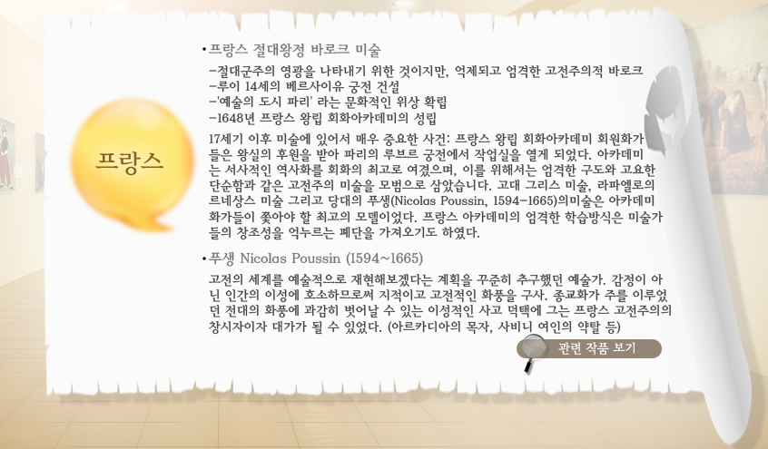 - ÇÁ¶û½º ÇÁ¶û½º Àý´ë¿ÕÁ¤ ¹Ù·ÎÅ© ¹Ì¼ú -Àý´ë±ºÁÖÀÇ ¿µ±¤À» ³ªÅ¸³»±â À§ÇÑ °ÍÀÌÁö¸¸, ¾ïÁ¦µÇ°í ¾ö°ÝÇÑ °íÀüÁÖÀÇÀû ¹Ù·ÎÅ© -·çÀÌ 14¼¼ ÀÇ º£¸£»çÀÌÀ¯ ±ÃÀü °Ç¼³ -'¿¹¼úÀÇ µµ½Ã ÆÄ¸®'¶ó´Â ¹®ÈÀûÀÎ À§»ó È®¸³ -1648³â ÇÁ¶û½º ¿Õ¸³ ȸȾÆÄ«µ¥¹ÌÀÇ ¼º¸³ 17¼¼±â ÀÌÈÄ ¹Ì¼ú¿¡ ÀÖ¾î¼ ¸Å¿ì Áß¿äÇÑ »ç°Ç: ÇÁ¶û½º ¿Õ¸³ ȸȾÆÄ«µ¥¹Ì ȸ¿øÈ°¡µéÀº ¿Õ½ÇÀÇ ÈÄ¿øÀ» ¹Þ¾Æ ÆÄ¸®ÀÇ ·çºê¸£ ±ÃÀü¿¡¼ ÀÛ¾÷½ÇÀ» ¿°Ô µÇ¾ú´Ù. ¾ÆÄ«µ¥¹Ì´Â ¼»çÀûÀÎ ¿ª»çȸ¦ ȸÈÀÇ ÃÖ°í·Î ¿©°åÀ¸¸ç, À̸¦ À§Çؼ´Â ¾ö°ÝÇÑ ±¸µµ¿Í °í¿äÇÑ ´Ü¼øÇÔ°ú °°Àº °íÀüÁÖÀÇ ¹Ì¼úÀ» ¸ð¹üÀ¸·Î »ï¾Ò½À´Ï´Ù. °í´ë ±×¸®½º ¹Ì¼ú, ¶óÆÄ¿¤·ÎÀÇ ¸£³×»ó½º ¹Ì¼ú ±×¸®°í ´ç´ëÀÇ Çª»ý(Nicolas Poussin, 1594-1665)Àǹ̼úÀº ¾ÆÄ«µ¥¹Ì Ȱ¡µéÀÌ ÂÑ¾Æ¾ß ÇÒ ÃÖ°íÀÇ ¸ðµ¨À̾ú´Ù. ÇÁ¶û½º ¾ÆÄ«µ¥¹ÌÀÇ ¾ö°ÝÇÑ ÇнÀ¹æ½ÄÀº ¹Ì¼ú°¡µéÀÇ Ã¢Á¶¼ºÀ» ¾ï´©¸£´Â Æó´ÜÀ» °¡Á®¿À±âµµ ÇÏ¿´´Ù. Ǫ»ý Nicolas Poussin (1594~1665) ÇÁ¶û½ºÀÇ È°¡. °íÀüÀÇ ¼¼°è¸¦ ¿¹¼úÀûÀ¸·Î ÀçÇöÇØº¸°Ú´Ù´Â °èȹÀ» ²ÙÁØÈ÷ Ãß±¸Çß´ø ¿¹¼ú°¡. °¨Á¤ÀÌ ¾Æ´Ñ Àΰ£ÀÇ À̼º¿¡ È£¼ÒÇϹǷνá ÁöÀûÀÌ°í °íÀüÀûÀÎ ÈdzÀ» ±¸»ç. Á¾±³È°¡ ÁÖ¸¦ ÀÌ·ç¾ú´ø Àü´ëÀÇ Èdz¿¡ °ú°¨È÷ ¹þ¾î³¯ ¼ö ÀÖ´Â À̼ºÀûÀÎ »ç°í ´öÅÿ¡ ±×´Â ÇÁ¶û½º °íÀüÁÖÀÇÀÇ Ã¢½ÃÀÚÀÌÀÚ ´ë°¡°¡ µÉ ¼ö ÀÖ¾ú´Ù. (¾Æ¸£Ä«µð¾ÆÀÇ ¸ñÀÚ, »çºñ´Ï ¿©ÀÎÀÇ ¾àÅ» µî)
