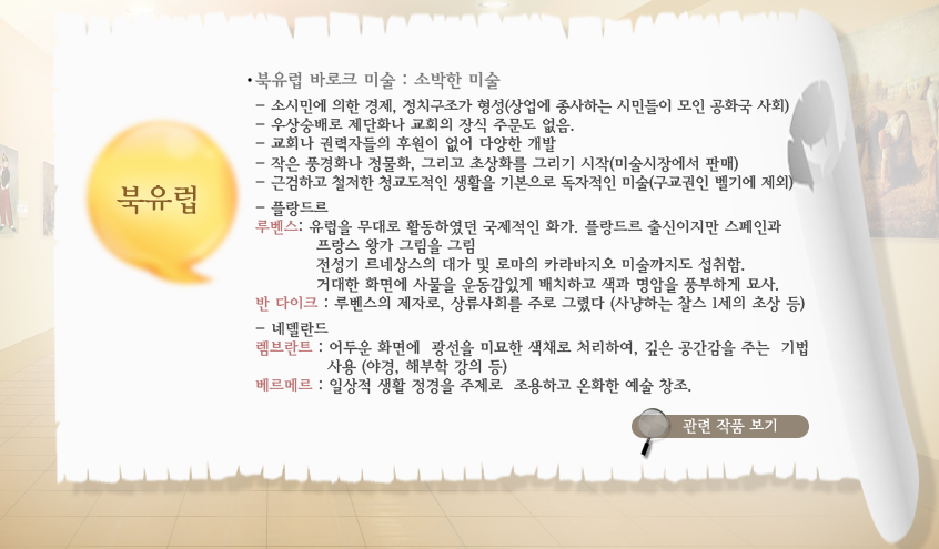 - ºÏÀ¯·´ ºÏÀ¯·´ ¹Ù·ÎÅ© ¹Ì¼ú : ¼Ò¹ÚÇÑ ¹Ì¼ú - ¼Ò½Ã¹Î¿¡ ÀÇÇÑ °æÁ¦, Á¤Ä¡±¸Á¶°¡ Çü¼º(»ó¾÷¿¡ Á¾»çÇÏ´Â ½Ã¹ÎµéÀÌ ¸ðÀÎ °øÈ±¹ »çȸ) - ¿ì»ó¼þ¹è·Î Á¦´Üȳª ±³È¸ÀÇ Àå½Ä ÁÖ¹®µµ ¾øÀ½. - ±³È¸³ª ±Ç·ÂÀÚµéÀÇ ÈÄ¿øÀÌ ¾ø¾î ´Ù¾çÇÑ °³¹ß - ÀÛÀº dz°æÈ³ª Á¤¹°È, ±×¸®°í ÃÊ»óȸ¦ ±×¸®±â ½ÃÀÛ(¹Ì¼ú½ÃÀå¿¡¼ ÆÇ¸Å) - ±Ù°ËÇϰí öÀúÇÑ Ã»±³µµÀûÀÎ »ýȰÀ» ±âº»À¸·Î µ¶ÀÚÀûÀÎ ¹Ì¼ú(±¸±³±ÇÀÎ º§±â¿¡ Á¦¿Ü) - Çöûµå¸£ ·çº¥½º: °¡Àå ¹Ù·ÎÅ©ÀûÀ̶ó´Â Æò°¡¸¦ µè´Â Ȱ¡·Î, dzºÎÇÑ ¾ç°¨ÀÇ ÀÎü, ´ë´ãÇÏ°í µ¿ÀûÀÎ ±¸µµ, È·ÁÇÑ »öä°¡ Ư¡ ¹Ý ´ÙÀÌÅ© : ·çº¥½ºÀÇ Á¦ÀÚ·Î, »ó·ù»çȸ¸¦ ÁÖ·Î ±×·È´Ù (»ç³ÉÇÏ´Â Âû½º 1¼¼ÀÇ ÃÊ»ó µî) - ³×µ¨¶õµå ·½ºê¶õÆ® : ¾îµÎ¿î ȸ鿡 ±¤¼±À» ¹Ì¹¦ÇÑ »öä·Î ó¸®ÇÏ¿©, ±íÀº °ø°£°¨À» ÁÖ´Â ±â¹ý »ç¿ë (¾ß°æ, ÇØºÎÇÐ °ÀÇ µî) º£¸£¸Þ¸£ : ÀÏ»óÀû »ýȰ Á¤°æÀ» ÁÖÁ¦·Î Á¶¿ëÇÏ°í ¿ÂÈÇÑ ¿¹¼ú âÁ¶. ·çº¥½º ¹Ý´ÙÀÌÅ© ·½ºê¶õÆ® º£¸£¸Þ¸£